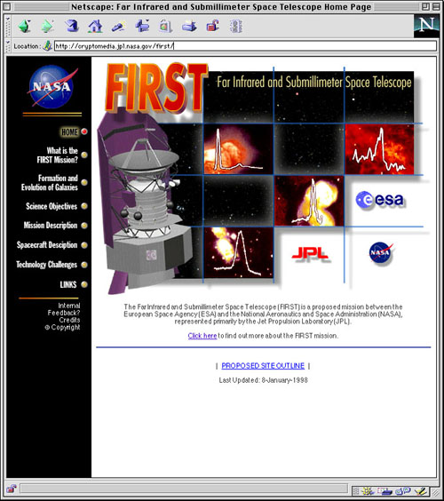 Screenshot of first page of JPL's Far Infrared and Submillimeter Space Telescope (FIRST) Mission home page. Client: NASA/JPL (work done as NASA/JPL employee) Provided through the courtesy of the Jet Propulsion Laboratory, California Institute of Technology |